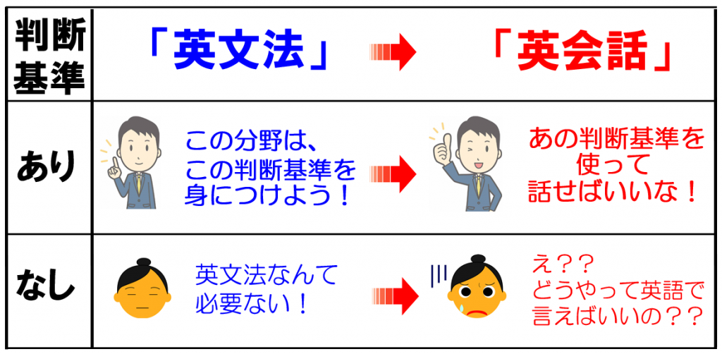 英語を話す前提のルールを知らないと、英語は話せるようにはなりません。ただし、ここでお伝えする英文法とは、訳の分からない、つまらない英文法ではなく、「あなたがこれから、自由に英語を話すための英文法」。つまり、「話すための英文法」です。それにより、英会話で使える「判断基準を持つ」ことができます。